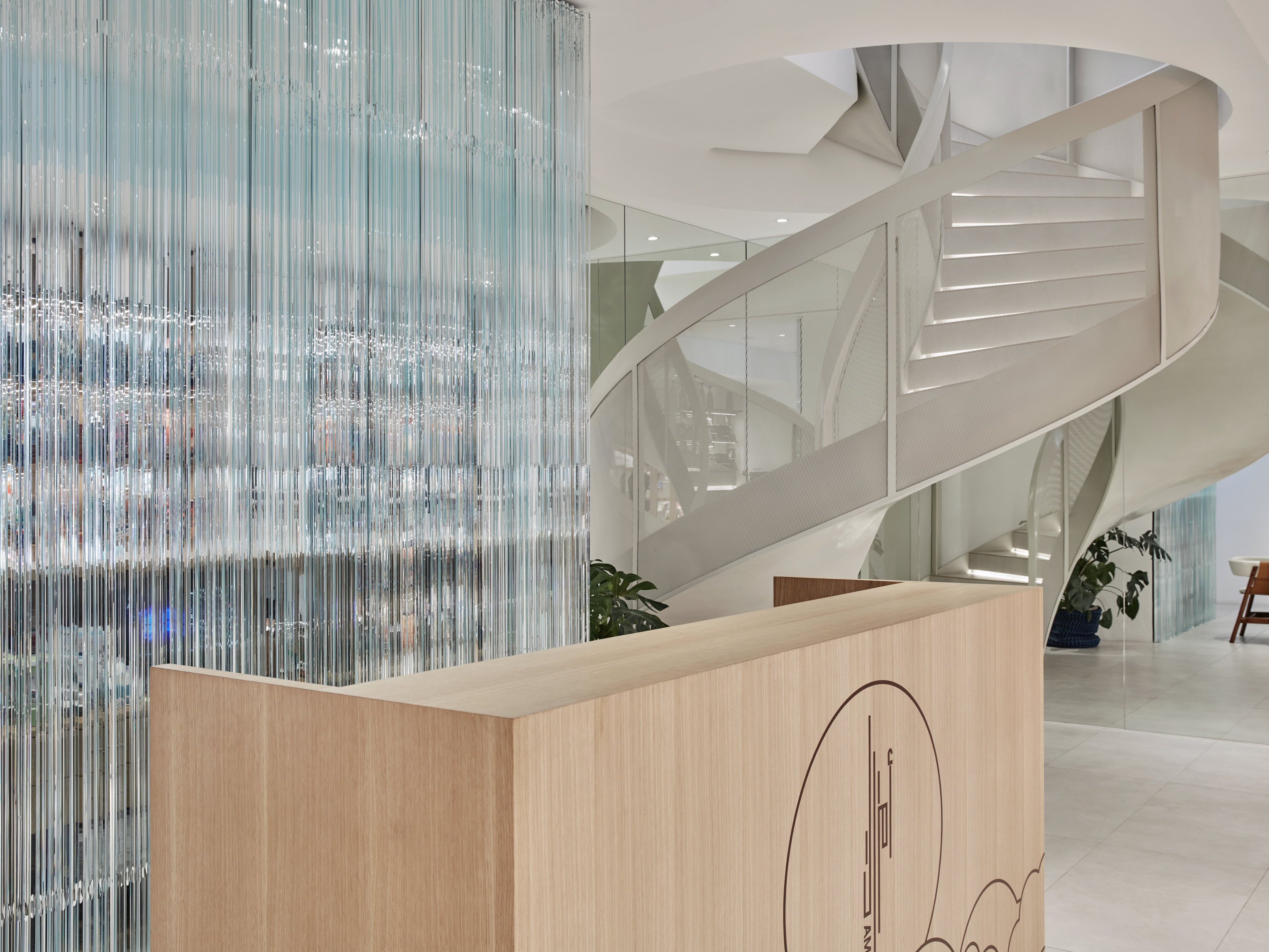 To contrast the loud and dynamic traditions, the choice of palette was toned down to a subtle harmonious beige, with some burgundy and wooden touches. The arc motif is visible throughout the space - from the openings, to the ceilings, tiles, chairs and lighting features.